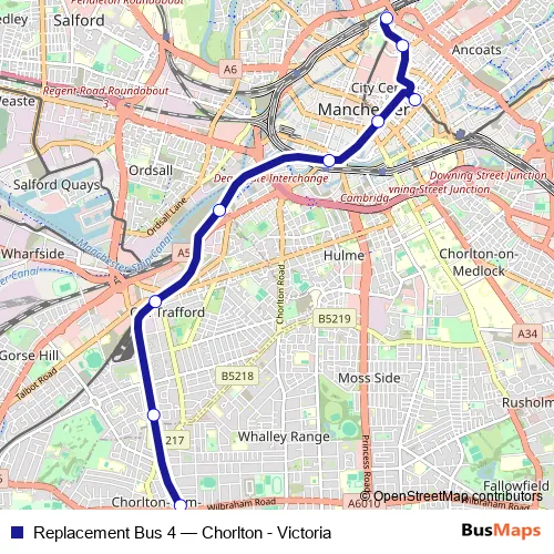 The first stop of the Replacement Bus 4 tram route is Victoria (Manchester Metrolink) and the last stop is Chorlton (Manchester Metrolink). Replacement Bus 4 (Chorlton - Victoria) is operational during everyday.