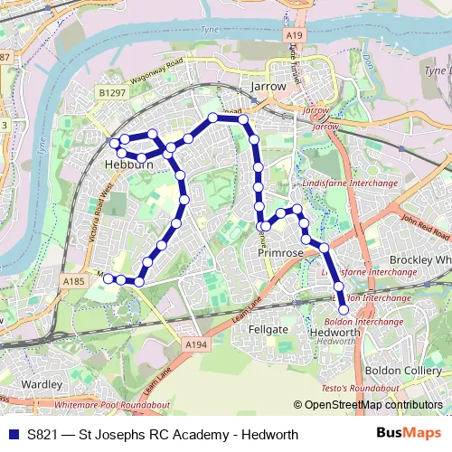 The first stop of the S821 bus route is St Joseph's Catholic Academy and the last stop is Hedworth Lane. S821 (St Josephs RC Academy - Hedworth) is operational during on weekdays.