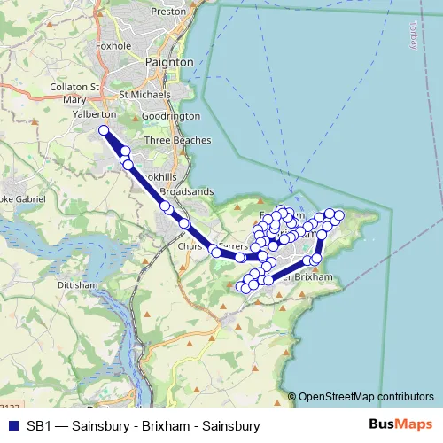 The first stop of the SB1 bus route is Brixham Road Sainsburys and the last stop is Brixham Road Sainsburys. SB1 (Sainsbury - Brixham - Sainsbury) is operational during everyday.