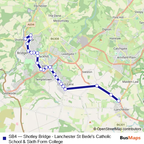Click here to view the nearest SB4 - Shotley Bridge - Lanchester St Bede's Catholic School & Sixth Form College bus stop.
