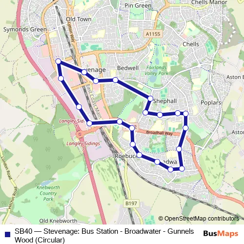The first stop of the SB40 bus route is Bus Station and the last stop is Bus Station. SB40 (Stevenage: Bus Station - Broadwater - Gunnels Wood (Circular)) is operational during on weekdays.