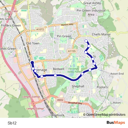 The first stop of the Sb12 bus route is Chells Hudson Road Mobbsbury Way and the last stop is