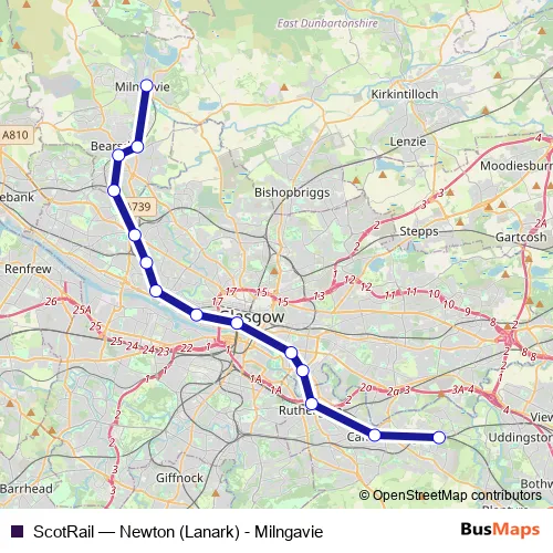 The first stop of the ScotRail rail route is Newton (Lanark) and the last stop is Milngavie. ScotRail (Newton (Lanark) - Milngavie) is operational during everyday.