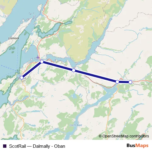 The first stop of the ScotRail rail route is Oban and the last stop is Dalmally. ScotRail (Dalmally - Oban) is operational during on weekdays.