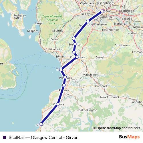 The first stop of the ScotRail rail route is Glasgow Central and the last stop is Girvan. ScotRail (Glasgow Central - Girvan) is operational during everyday.