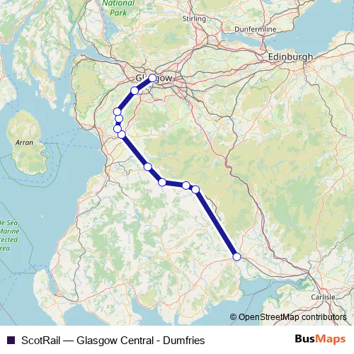 The first stop of the ScotRail rail route is Dumfries and the last stop is Glasgow Central. ScotRail (Glasgow Central - Dumfries) is operational during everyday.