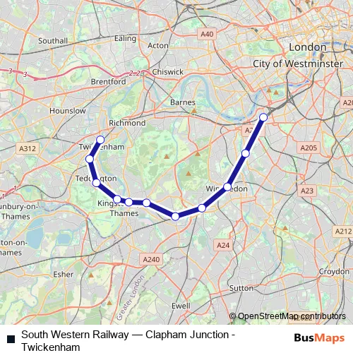 The first stop of the South Western Railway bus route is Clapham Junction and the last stop is Twickenham. South Western Railway (Clapham Junction - Twickenham) is operational during everyday.
