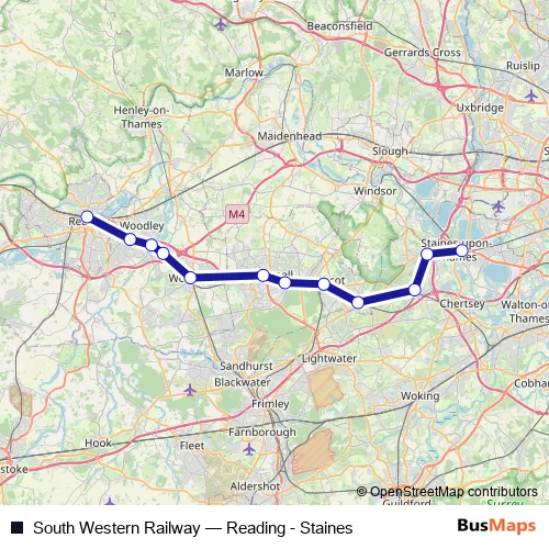 The first stop of the South Western Railway bus route is Staines and the last stop is Reading. South Western Railway (Reading - Staines) is operational during on weekends.