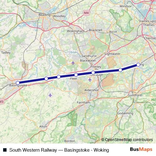 The first stop of the South Western Railway bus route is Woking and the last stop is Basingstoke. South Western Railway (Basingstoke - Woking) is operational during on weekends.