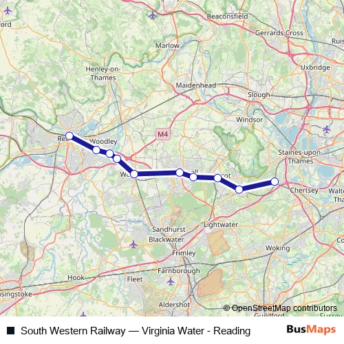 The first stop of the South Western Railway bus route is Virginia Water and the last stop is Reading. South Western Railway (Virginia Water - Reading) is operational during everyday.