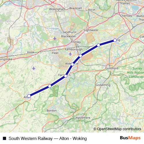 The first stop of the South Western Railway bus route is Alton and the last stop is Woking. South Western Railway (Alton - Woking) is operational during everyday.