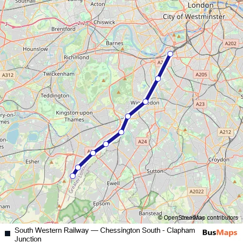 The first stop of the South Western Railway bus route is Clapham Junction and the last stop is Chessington South. South Western Railway (Chessington South - Clapham Junction) is operational during on weekends.