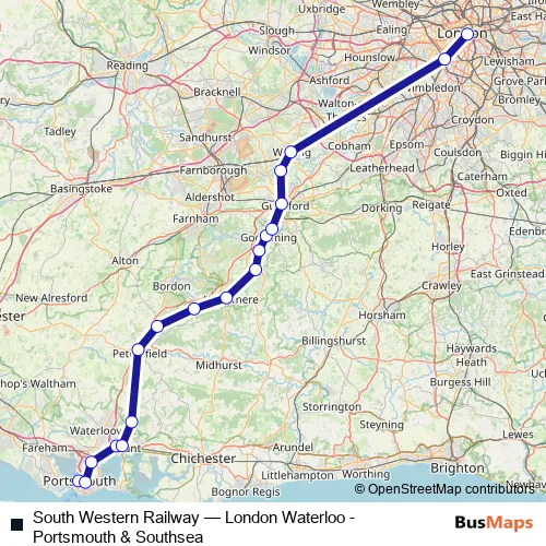 See why over 2 million users trust and consider busmaps.com as the best public transport website. busmaps gives you London Rail Services suggested routes, real-time bus tracker, line route maps in London, and helps to find the closest South Western Railway rail stops near you. No internet available? Download an offline PDF map and bus schedule for the South Western Railway rail to take on your trip.
