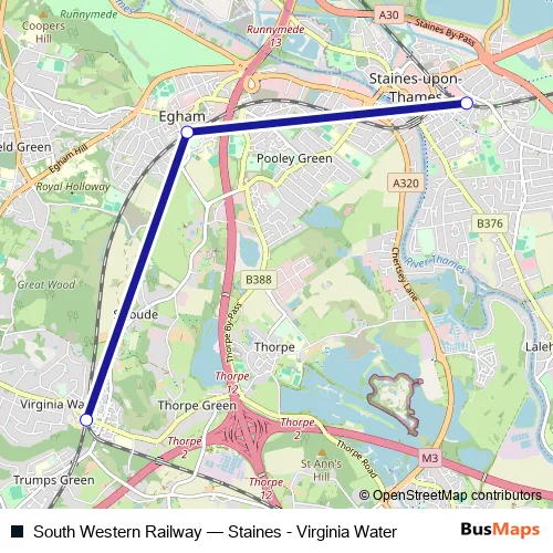 The first stop of the South Western Railway rail route is Staines and the last stop is Virginia Water. South Western Railway (Staines - Virginia Water) is operational during everyday.