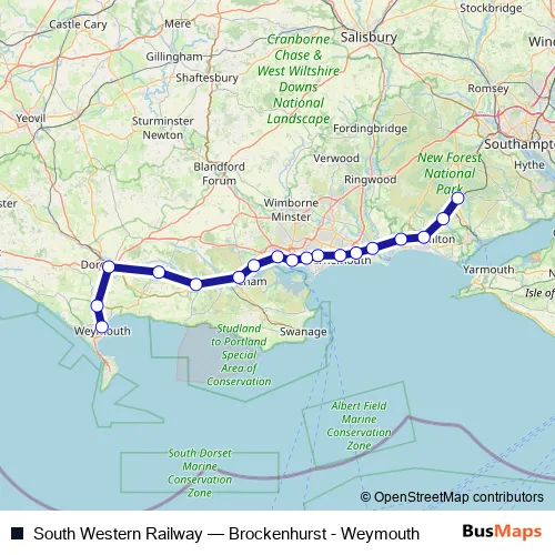 The first stop of the South Western Railway rail route is Brockenhurst and the last stop is