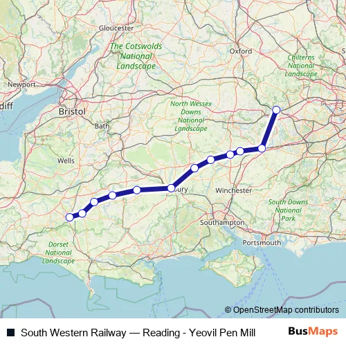 The first stop of the South Western Railway rail route is Reading and the last stop is Yeovil Pen Mill. South Western Railway (Reading - Yeovil Pen Mill) is operational during on weekends.