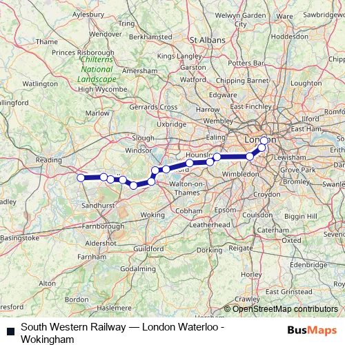 See why over 2 million users trust and consider busmaps.com as the best public transport website. busmaps gives you London Rail Services suggested routes, real-time bus tracker, line route maps in London, and helps to find the closest South Western Railway rail stops near you. No internet available? Download an offline PDF map and bus schedule for the South Western Railway rail to take on your trip.