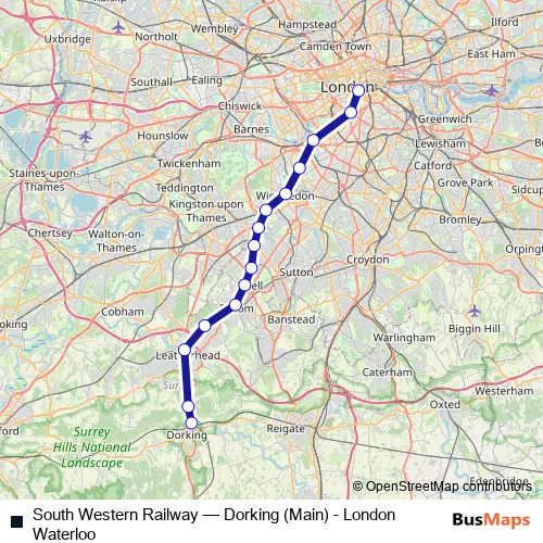 The first stop of the South Western Railway rail route is London Waterloo and the last stop is Dorking (Main). South Western Railway (Dorking (Main) - London Waterloo) is operational during everyday.