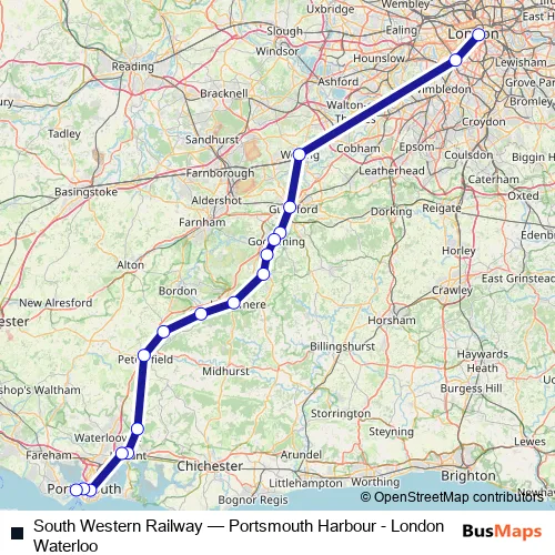 The first stop of the South Western Railway rail route is London Waterloo and the last stop is Portsmouth Harbour. South Western Railway (Portsmouth Harbour - London Waterloo) is operational during everyday.