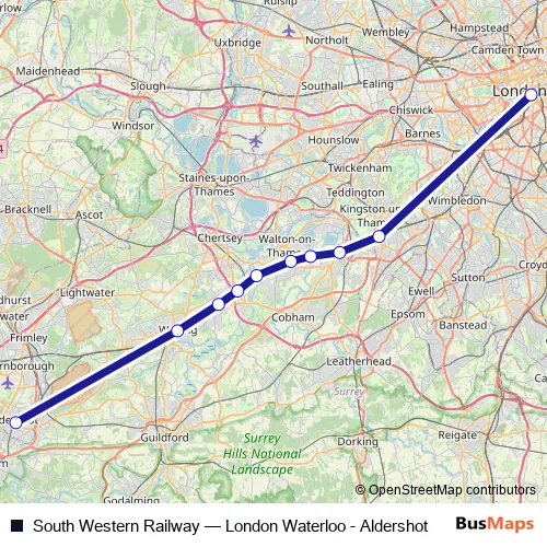 The first stop of the South Western Railway rail route is London Waterloo and the last stop is Aldershot. South Western Railway (London Waterloo - Aldershot) is operational during on weekdays.