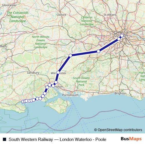 The first stop of the South Western Railway rail route is Poole and the last stop is London Waterloo. South Western Railway (London Waterloo - Poole) is operational during everyday.