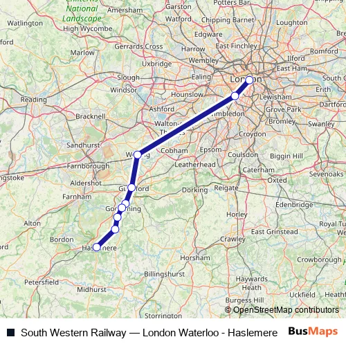 The first stop of the South Western Railway rail route is London Waterloo and the last stop is Haslemere. South Western Railway (London Waterloo - Haslemere) is operational during everyday.