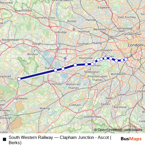 The first stop of the South Western Railway rail route is Clapham Junction and the last stop is Ascot (Berks). South Western Railway (Clapham Junction - Ascot (Berks)) is operational during everyday.