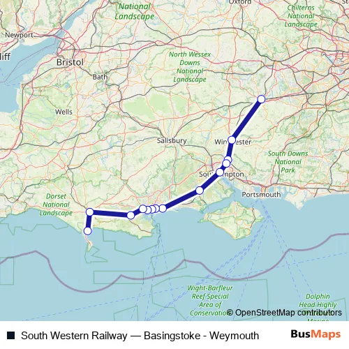 The first stop of the South Western Railway rail route is Basingstoke and the last stop is