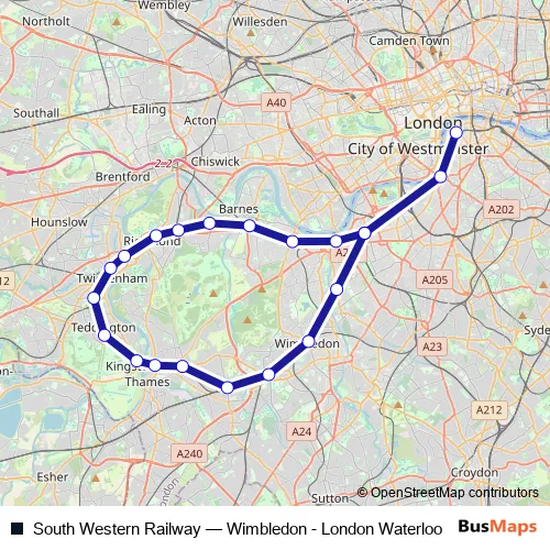 See why over 2 million users trust and consider busmaps.com as the best public transport website. busmaps gives you London Rail Services suggested routes, real-time bus tracker, line route maps in London, and helps to find the closest South Western Railway rail stops near you. No internet available? Download an offline PDF map and bus schedule for the South Western Railway rail to take on your trip.