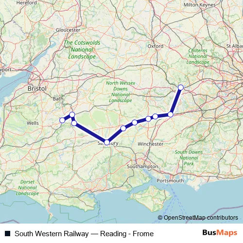 The first stop of the South Western Railway rail route is Reading and the last stop is Frome. South Western Railway (Reading - Frome) is operational during everyday.