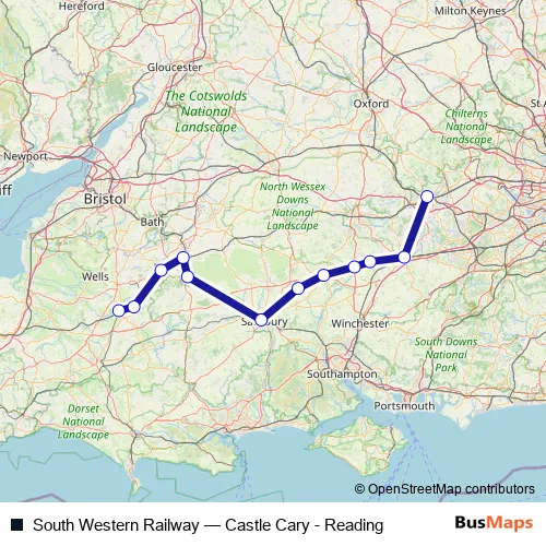 The first stop of the South Western Railway rail route is Castle Cary and the last stop is Reading. South Western Railway (Castle Cary - Reading) is operational during everyday.