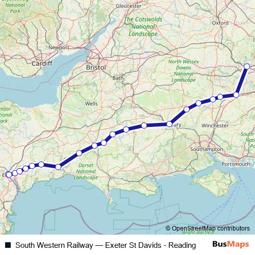 The first stop of the South Western Railway rail route is Exeter St Davids and the last stop is Reading. South Western Railway (Exeter St Davids - Reading) is operational during everyday.