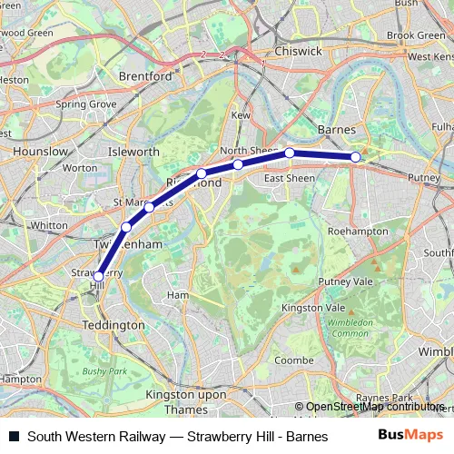 The first stop of the South Western Railway rail route is Strawberry Hill and the last stop is