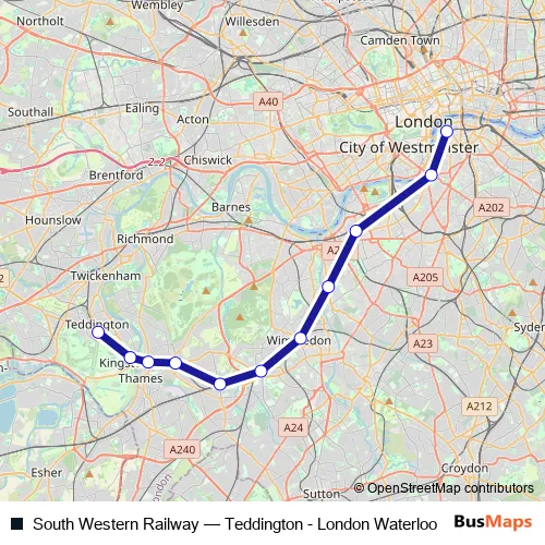 The first stop of the South Western Railway rail route is Teddington and the last stop is London Waterloo. South Western Railway (Teddington - London Waterloo) is operational during everyday.