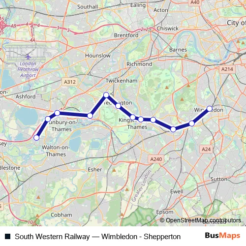 The first stop of the South Western Railway rail route is Wimbledon and the last stop is Shepperton. South Western Railway (Wimbledon - Shepperton) is operational during on weekdays.