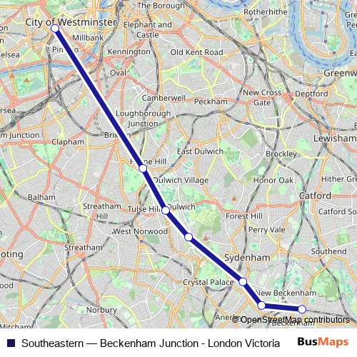 The first stop of the Southeastern bus route is Beckenham Junction and the last stop is London Victoria. Southeastern (Beckenham Junction - London Victoria) is operational during everyday.