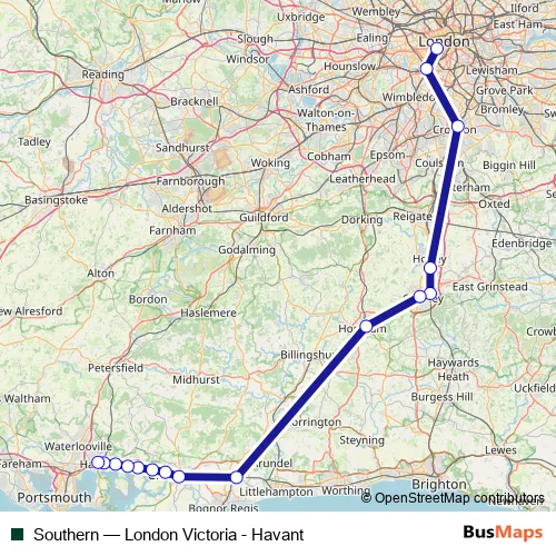 The first stop of the Southern rail route is London Victoria and the last stop is Havant. Southern (London Victoria - Havant) is operational during on weekdays.