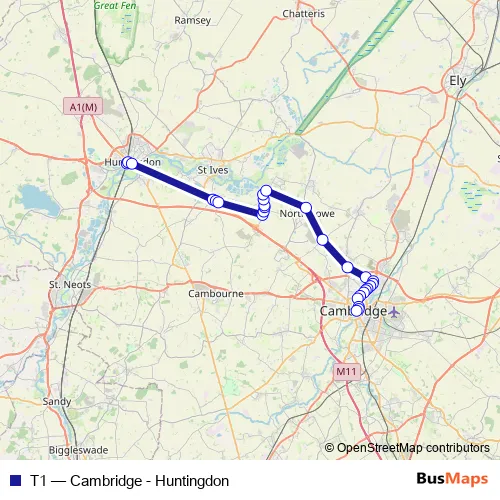 Click here to view the nearest T1 - Cambridge - Huntingdon bus stop.