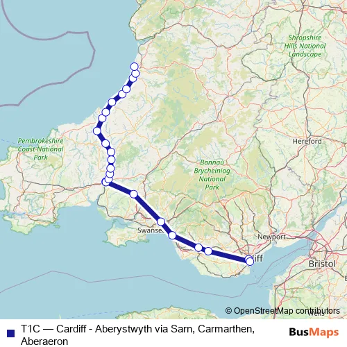 Bus T1C - Cardiff - Aberystwyth via Sarn, Carmarthen, Aberaeron in Carmarthen: Stops & Timetable