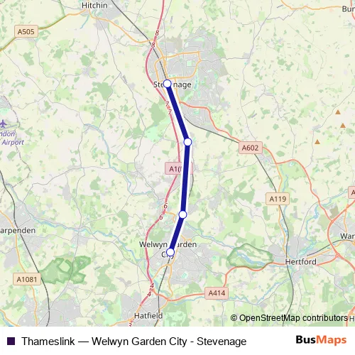 The first stop of the Thameslink bus route is Welwyn Garden City and the last stop is Stevenage. Thameslink (Welwyn Garden City - Stevenage) is operational during everyday.