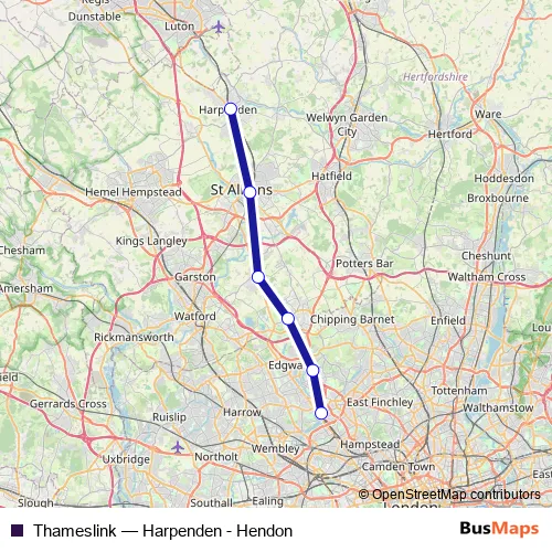 The first stop of the Thameslink bus route is Harpenden and the last stop is Hendon. Thameslink (Harpenden - Hendon) is operational during everyday.