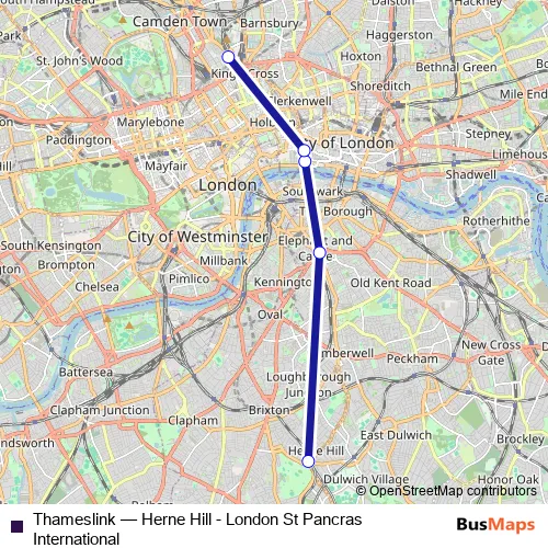 The first stop of the Thameslink rail route is Herne Hill and the last stop is London St Pancras International. Thameslink (Herne Hill - London St Pancras International) is operational during everyday.