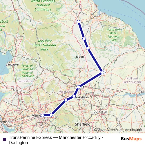 The first stop of the TransPennine Express rail route is Manchester Piccadilly and the last stop is Darlington. TransPennine Express (Manchester Piccadilly - Darlington) is operational during on weekdays.
