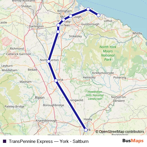 See why over 2 million users trust and consider busmaps.com as the best public transport website. busmaps gives you Northallerton Buses suggested routes, real-time bus tracker, line route maps in Northallerton, and helps to find the closest TransPennine Express bus stops near you. No internet available? Download an offline PDF map and bus schedule for the TransPennine Express bus to take on your trip.