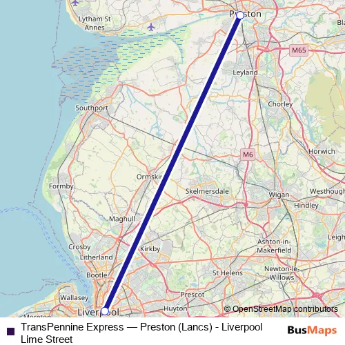 The first stop of the TransPennine Express bus route is Preston (Lancs) and the last stop is Liverpool Lime Street. TransPennine Express (Preston (Lancs) - Liverpool Lime Street) is operational during everyday.