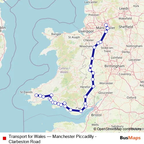 The first stop of the Transport for Wales rail route is Clarbeston Road and the last stop is Manchester Piccadilly. Transport for Wales (Manchester Piccadilly - Clarbeston Road) is operational during everyday.