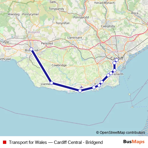 The first stop of the Transport for Wales rail route is Bridgend and the last stop is Cardiff Central. Transport for Wales (Cardiff Central - Bridgend) is operational during everyday.