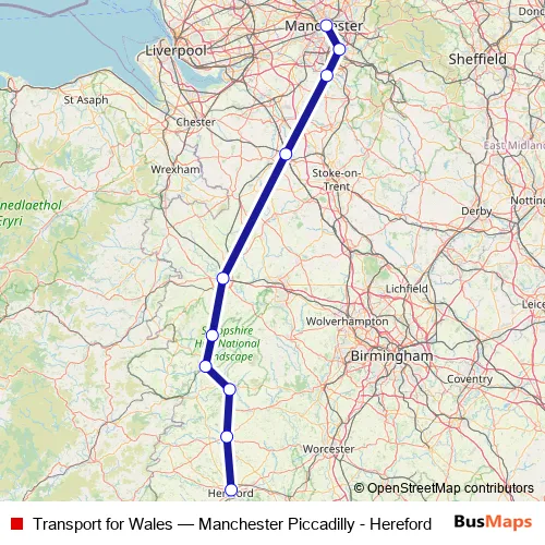 The first stop of the Transport for Wales rail route is Manchester Piccadilly and the last stop is Hereford. Transport for Wales (Manchester Piccadilly - Hereford) is operational during everyday.