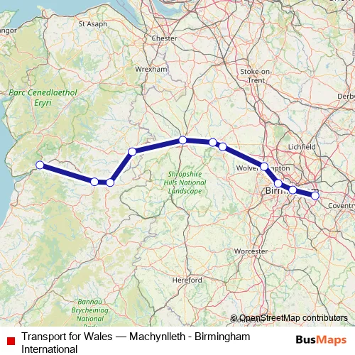 The first stop of the Transport for Wales rail route is Birmingham International and the last stop is Machynlleth. Transport for Wales (Machynlleth - Birmingham International) is operational during everyday.