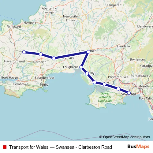 The first stop of the Transport for Wales rail route is Swansea and the last stop is Clarbeston Road. Transport for Wales (Swansea - Clarbeston Road) is operational during everyday.